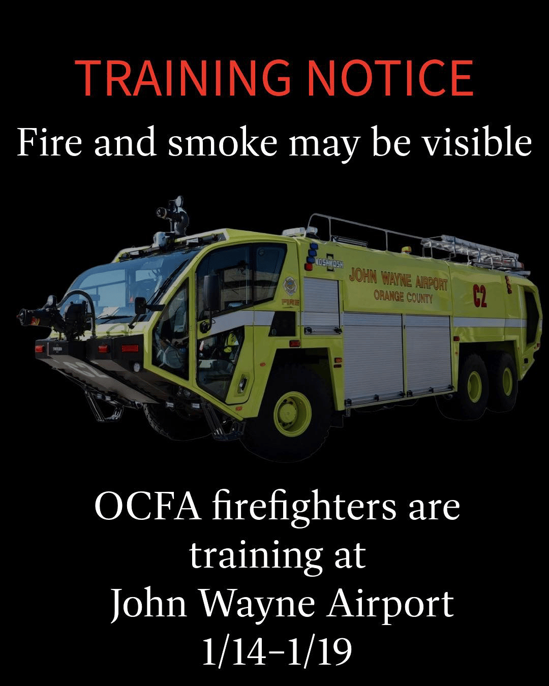 The Orange County Fire Authority is conducting FAA-required live fire training at John Wayne Airport from January 14–19. Fire or light smoke may be visible during this time in a designated training area. The exercises use clean-burning propane, produce minimal smoke, and are not expected to affect airport operations. The training supports preparedness for emergency response at the airport.