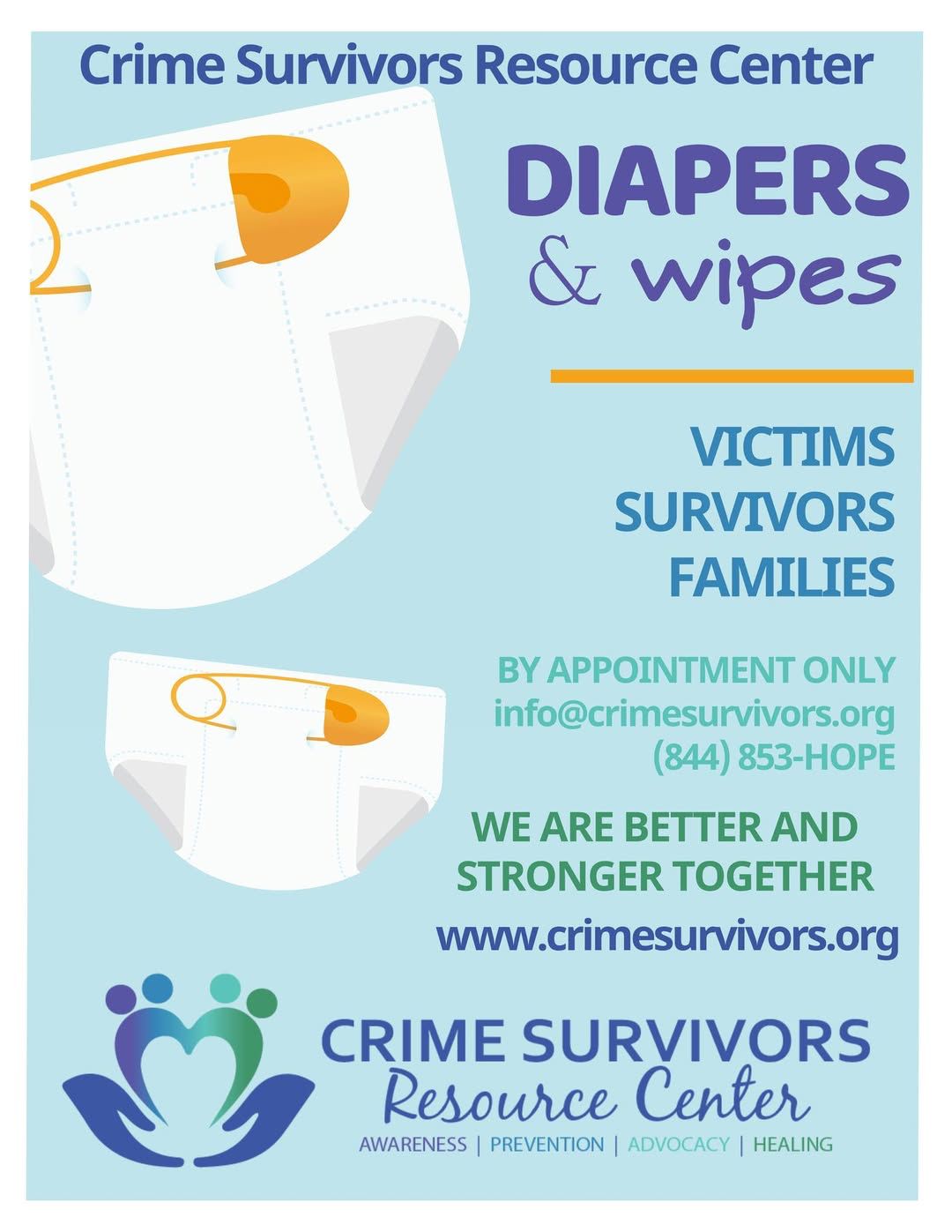 Crime Survivors Resource Center has diapers available for pickup, supporting approximately 100–150 children each month thanks to community partners and donors. Families in need can schedule a pickup by appointment, and donations of wipes, powder, and other baby essentials are also welcomed.