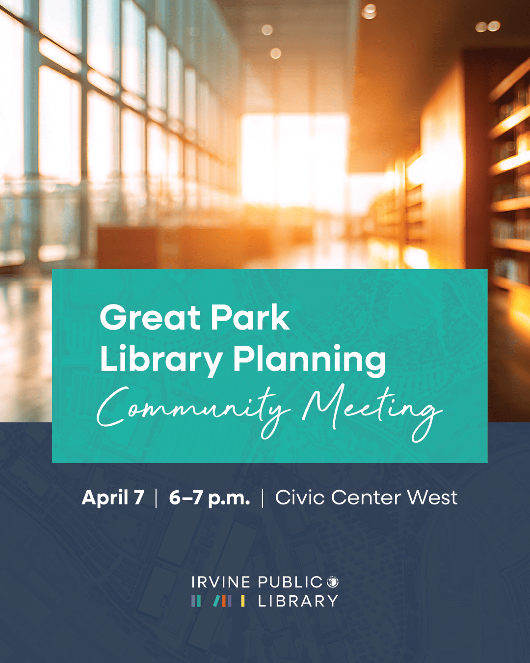 The City of Irvine and Irvine Public Library will host another community meeting on the future Great Park Library on Tuesday, April 7, at 6 p.m. at Civic Center West. Residents are invited to learn more about the project and share feedback to help shape the new library, which is planned as part of the Great Park Framework Plan and envisioned as Irvine’s future main library and a central community resource.