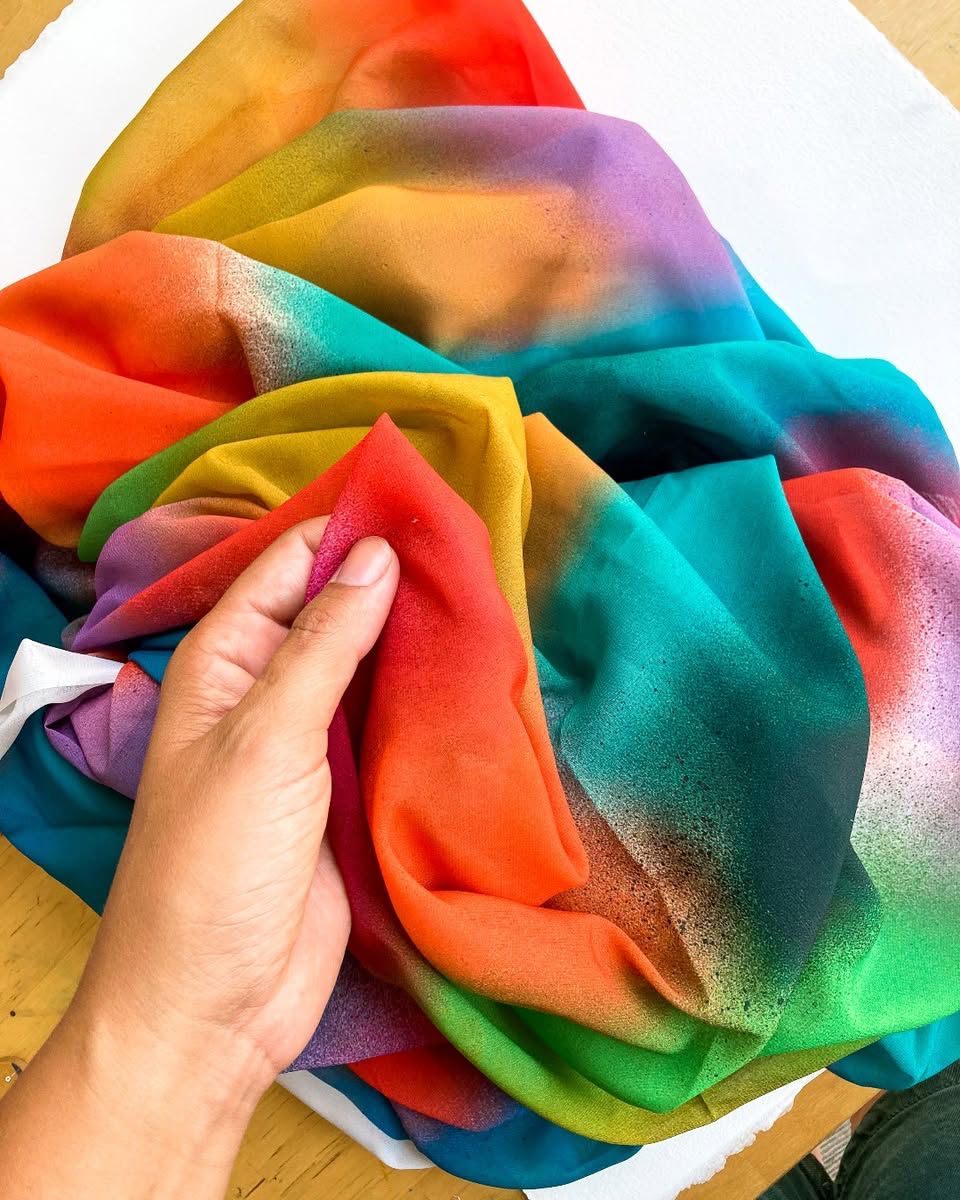 Artist Angie Stalker is featured in “First Day of Spring Is Today” exhibition at the Irvine Fine Arts Center, showcasing textile works made with digitally printed chiffon. Inspired by spray-painted patterns, she stretches and folds fabric over canvas to create textured, dynamic pieces; the group exhibition runs through May 16.