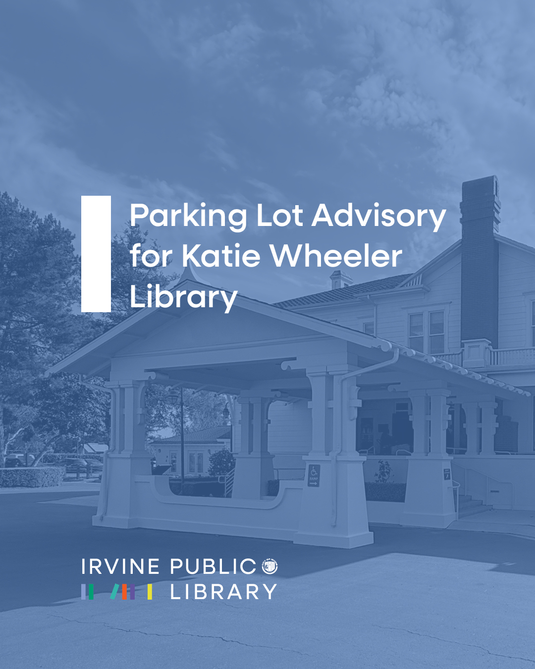 Visitors to Katie Wheeler Library may experience limited parking during the next two weekends, March 20–22 and March 27–29, 9 a.m.–5 p.m., due to slurry seal work in the Irvine Ranch Historic Park parking lot. Portions of the lot will remain available, with additional parking along Old Myford Road and Old Irvine Boulevard.