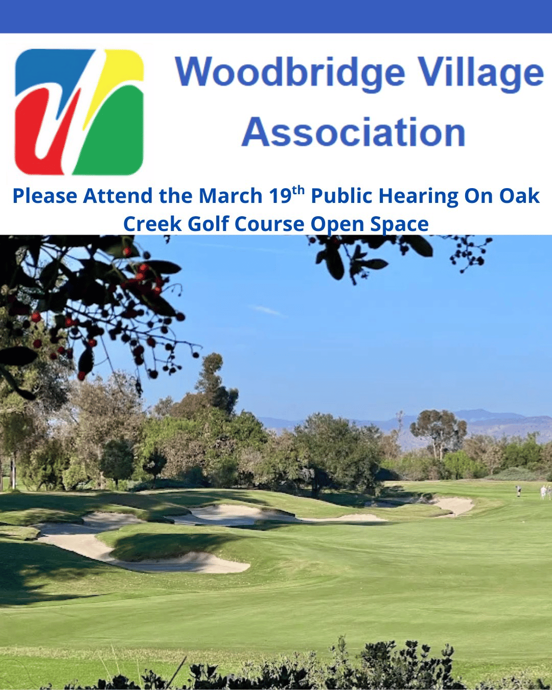 Woodbridge residents are encouraged to attend or participate in a public hearing on Thursday, March 19 at 5:30 p.m. at Irvine City Hall regarding a proposed zone change for the open space at Oak Creek Golf Course.