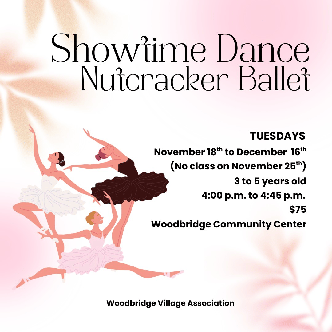 The Showtime Dance Nutcracker Ballet class invites young dancers ages 3–5 to experience the magic of The Nutcracker this holiday season! Classes run Tuesdays from Nov. 18 to Dec. 16 from 4:00–4:45 p.m. at the Woodbridge Community Center, offering a fun introduction to ballet in a festive setting.