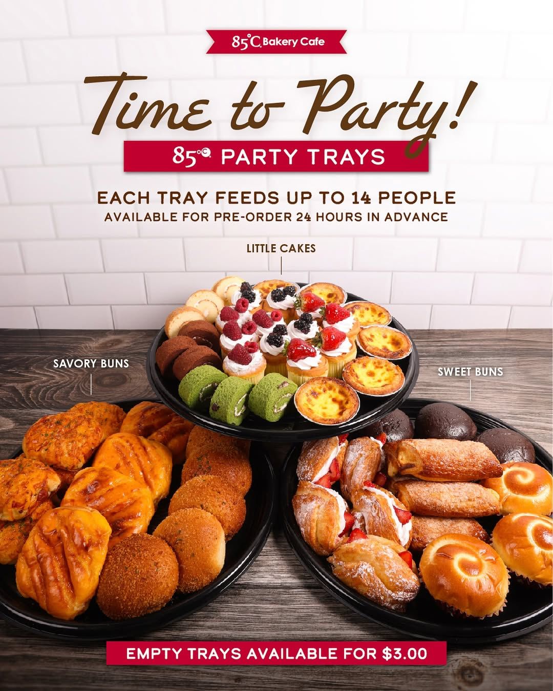 85°C Bakery Café now offers Party Trays perfect for gatherings and celebrations, each serving up to 14 people. Choose from Sweet Buns, Savory Buns, or Little Cakes assortments featuring favorites like taro rolls, cheese dogs, egg tarts, and matcha rolls. Available at all 85°C locations while supplies last.
