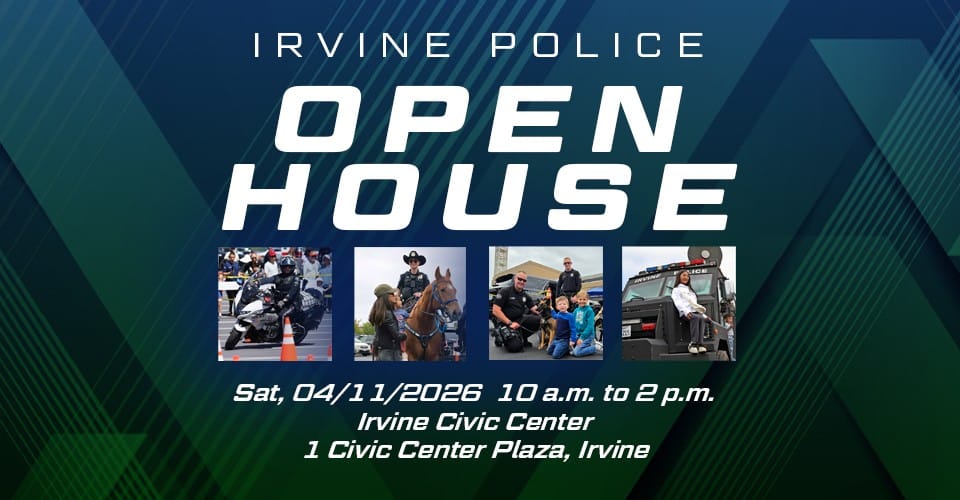 The Irvine Police Department will host its 2026 Open House on Saturday, April 11, from 10 a.m. to 2 p.m. at the Irvine Civic Center piazza and parking lot. The family-friendly event will feature police and fire vehicles, K-9, drone, and motorcycle demonstrations, plus photo opportunities, games, face painting, and special giveaways.