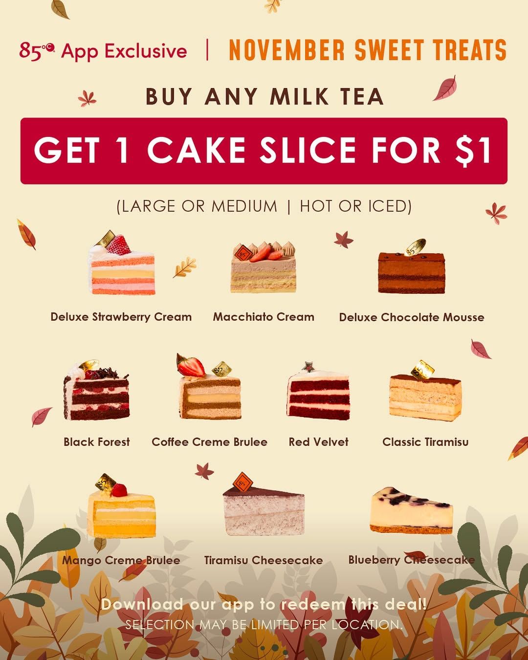 85°C Bakery Cafe is celebrating November with a cozy fall offer for APP members! Buy any Milk Tea (Hot or Iced, Large or Medium) and get a slice of cake for just $1. Whether you like it warm or chilled, it’s the perfect treat for tea and dessert lovers this season.