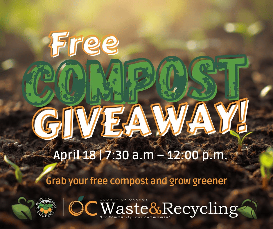 Give your garden a boost with free compost at OC Waste & Recycling’s Compost Giveaway on April 18 in Irvine, San Juan Capistrano, and Brea. Compost helps enrich your soil, while mulch keeps moisture in and weeds out. If you’re visiting Irvine or San Juan Capistrano, be sure to bring your own shovel and containers. You can also pick up compost and mulch year-round through OC Landfills.