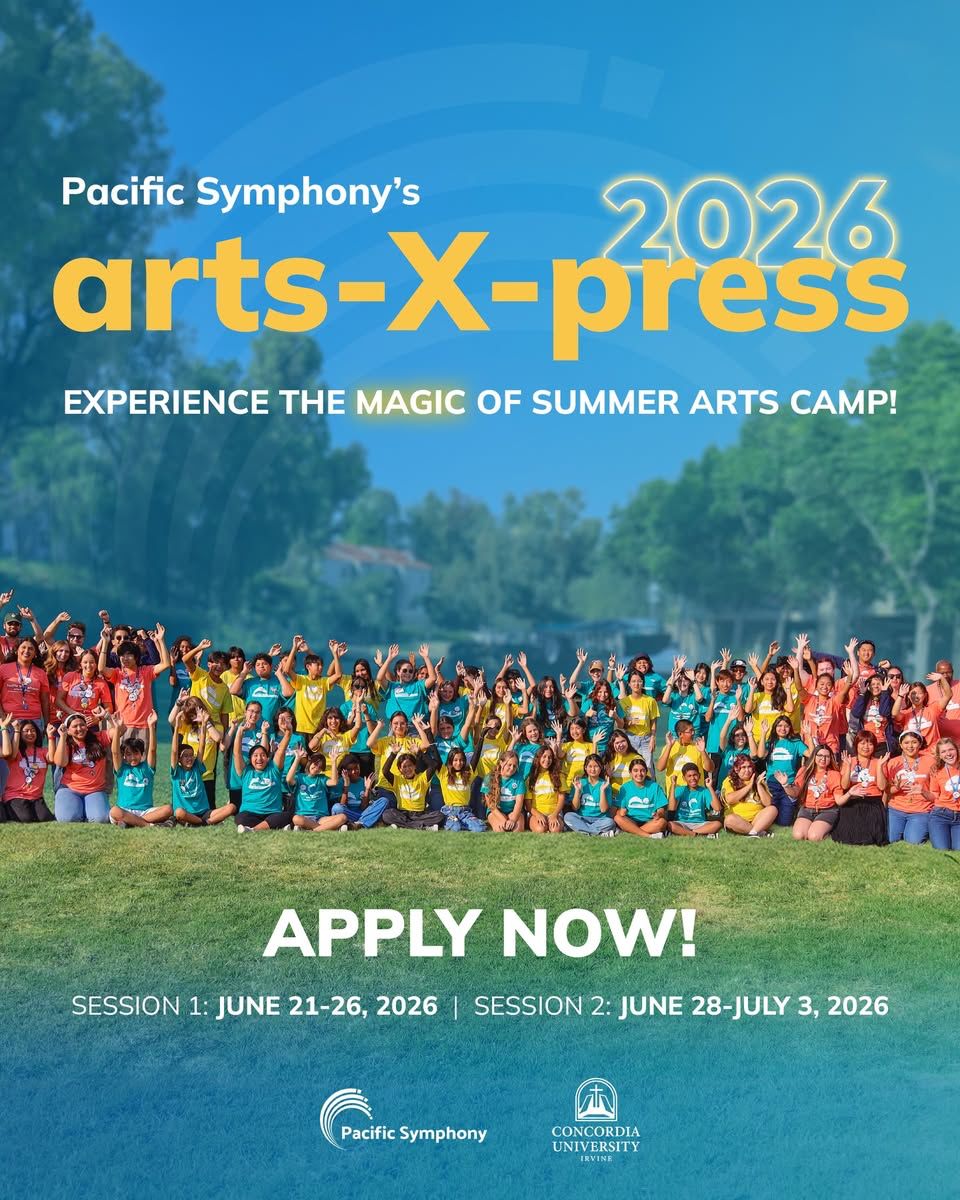 Pacific Symphony is now accepting applications for arts-X-press 2026, its summer arts immersion camp held at Concordia University Irvine this June. Open to current 6th, 7th, and 8th graders across Southern California, the weeklong program offers hands-on experiences in music, theater, dance, and visual arts, with two sessions available: June 21–26 and June 28–July 3. It’s a creative opportunity for students to explore new artistic interests, build confidence, and express themselves in a fun summer setting.