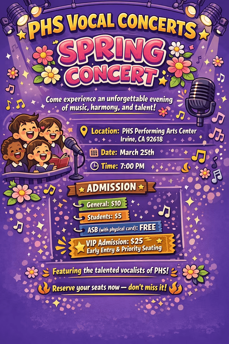 Portola High School’s Spring Vocal Concert is happening today, March 25 from 7:00–9:00 PM, at the PHS Performing Arts Center in Irvine. Join for an evening of live music and student performances showcasing vocal talent and harmony.