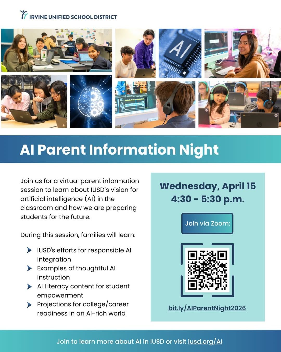 Irvine Unified School District will host a virtual parent information session on Wednesday, April 15, from 4:30 to 5:30 p.m. via Zoom to provide an overview of its approach to artificial intelligence (AI) in education. The session will cover responsible AI integration, examples of classroom instruction, student AI literacy, and considerations for college and career readiness in an AI-focused environment.