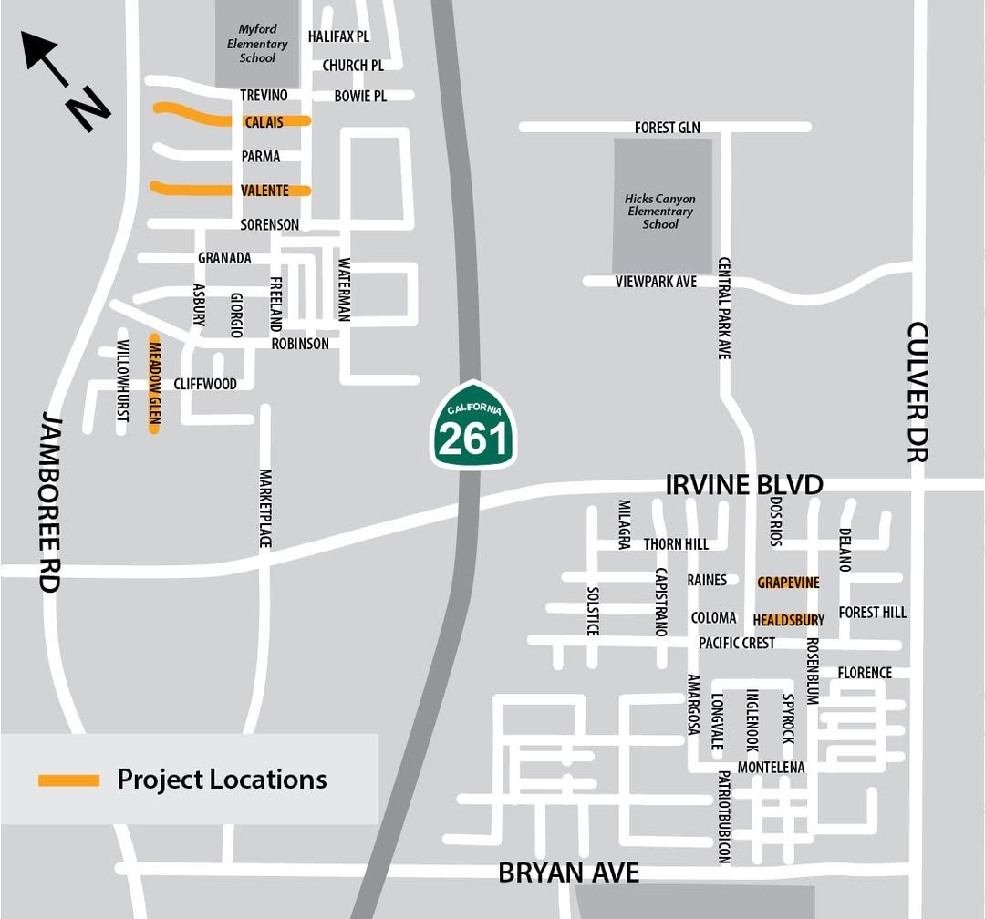 Roadwork is scheduled in West Irvine, Northpark, and Northpark Square on December 4–5, from 8 a.m.–4 p.m., as the City performs slurry seal and asphalt repairs. Affected streets include Meadow Glen, Calais, Valente, Grapevine, and Healdsbury.