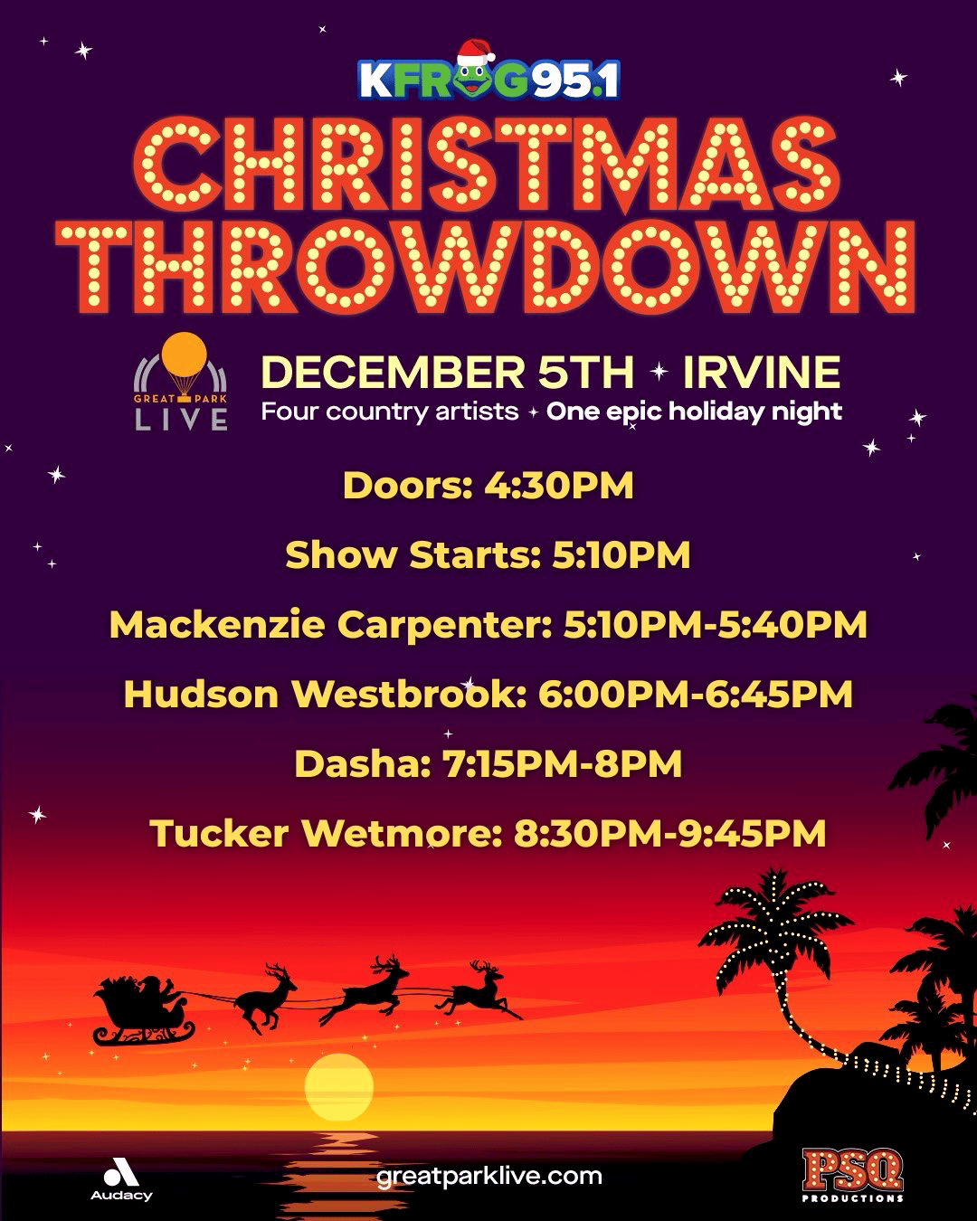 The Great Park is hosting the KFROG Christmas Throwdown this Friday, a festive country music event featuring live performances by Tucker Wetmore, Dasha, Hudson Westbrook, and Mackenzie Carpenter. Concertgoers can enjoy an energetic holiday show with multiple artists throughout the evening.