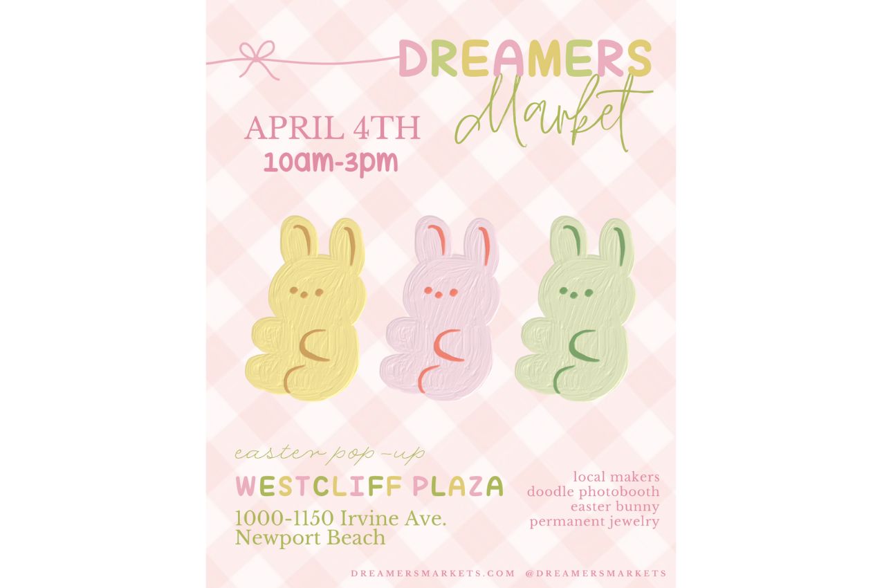 Dreamers Market is hosting an Easter Pop-Up at Westcliff Plaza in Newport Beach from March 23 through April 4, open daily from 10 a.m. to 3 p.m. The pop-up will feature local makers, a doodle photobooth, the Easter Bunny, and permanent jewelry at 1000–1150 Irvine Ave.