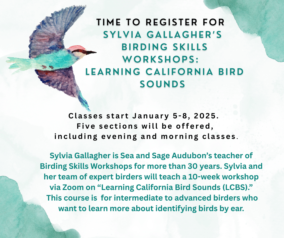 Join the Learning California Bird Sounds workshop from Sea & Sage Audubon, a friendly Zoom-based introduction that helps you start identifying birds the way experts do—by sound! Since seasoned birders recognize more than 90% of birds with their ears, this class is a great way to level up from bird-watching to bird-listening. Classes run January 5–8, 2026.