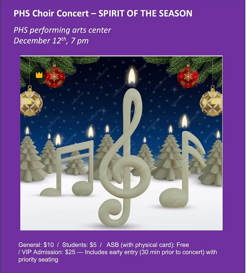December 12, 7 - 9 PM: PHS Choir Concert – SPIRIT OF THE SEASON