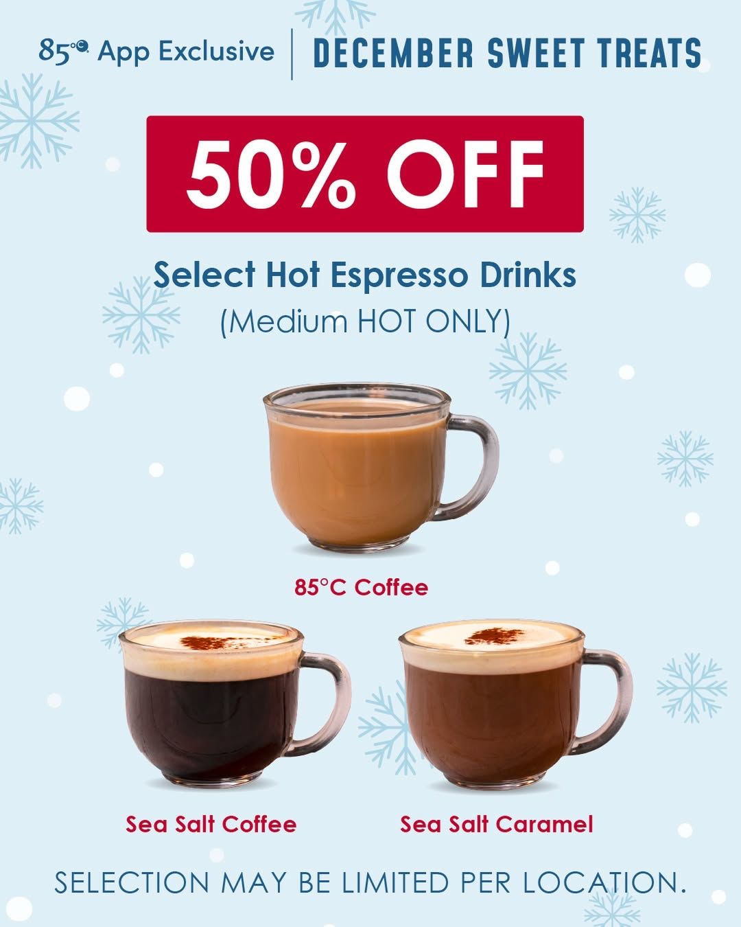 85°C Bakery Cafe is celebrating December by giving all app members a special coupon for 50% off select medium hot espresso drinks—including Sea Salt Coffee, Sea Salt Caramel, and the classic 85°C Coffee. Don’t miss these cozy cups at half the price!