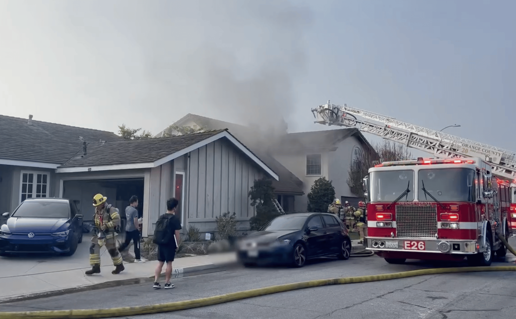 OCFA firefighters responded within five minutes to a house fire on Mariposa in Irvine shortly after 8 a.m., where crews conducted a rapid search while extinguishing the blaze. A woman was found inside, given medical aid, and transported to the hospital in critical condition; the cause remains under investigation, with support from Irvine Police and the American Red Cross.
