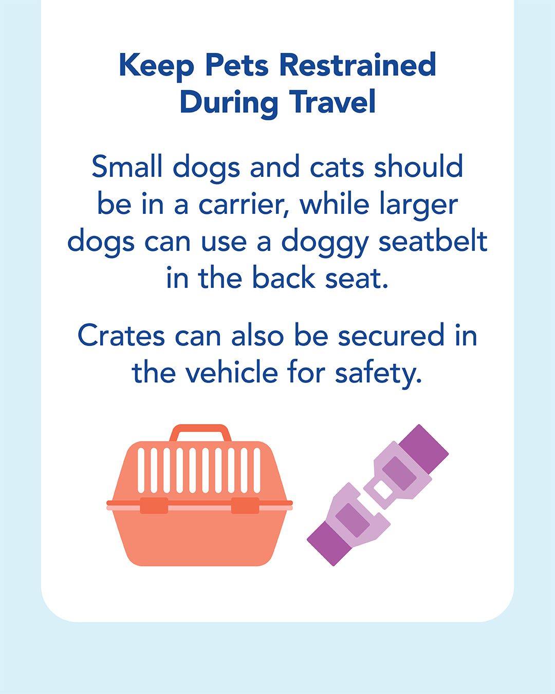 Buckle them in: Small pets should ride in a secure carrier, while larger dogs can use a doggy seatbelt in the back seat. Secure crates for extra safety.