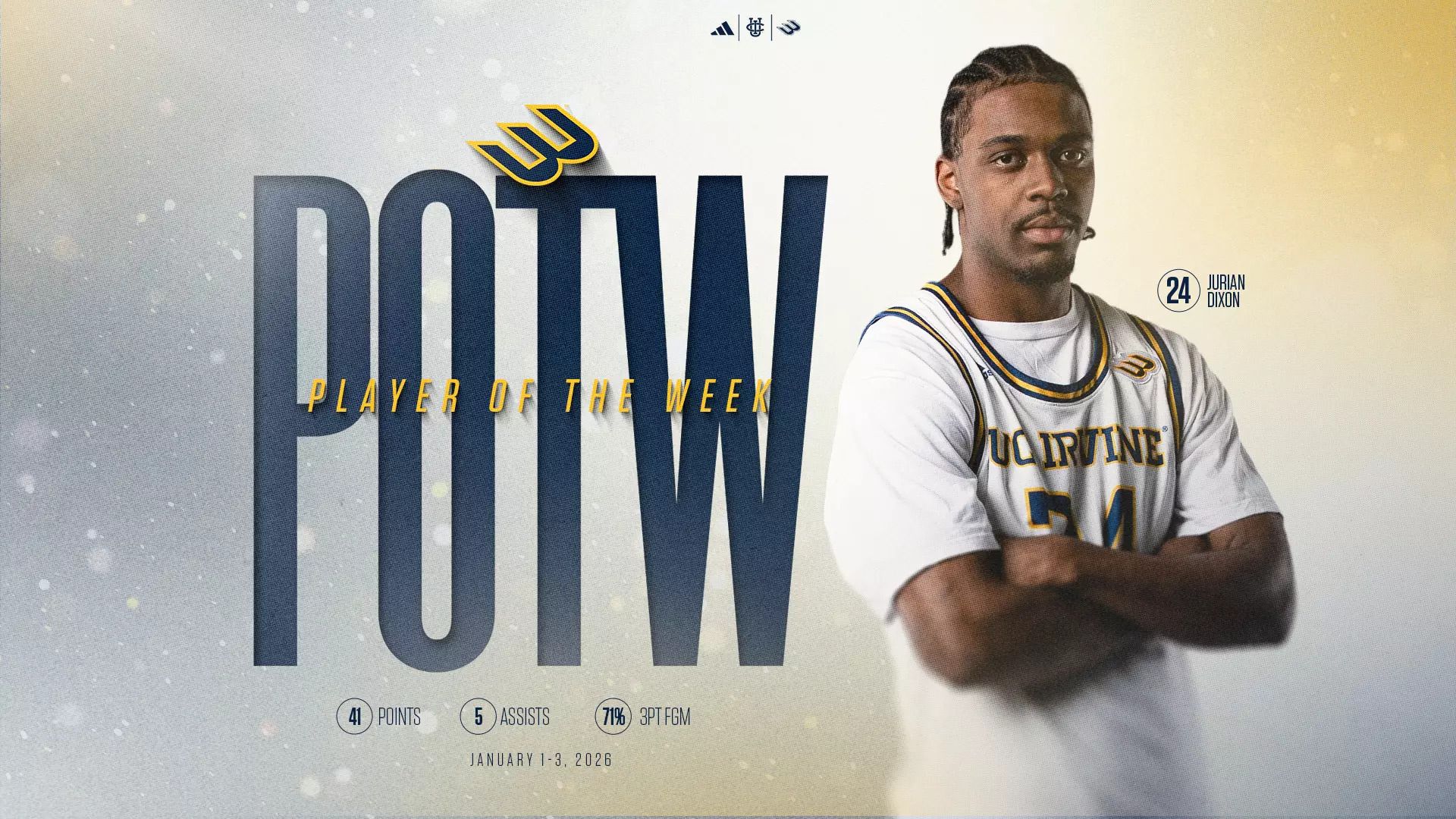 UC Irvine guard Jurian Dixon earned Big West Player of the Week honors after leading the Anteaters to a 2–0 road trip. The redshirt sophomore delivered back-to-back strong performances, highlighted by a career-high 26 points and elite three-point shooting, cementing himself as one of the conference’s top scorers and shooters this season.