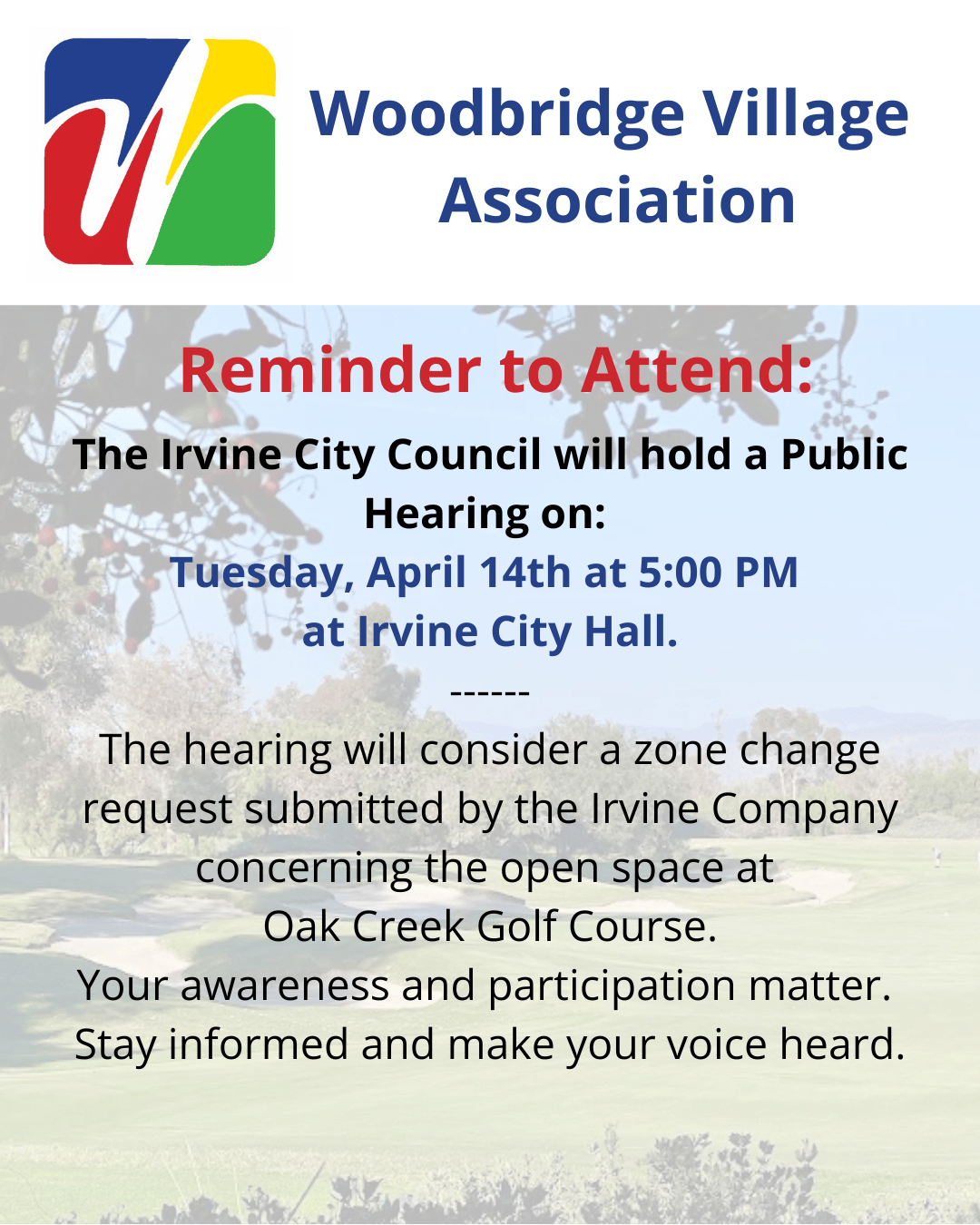 Irvine City Council approved a zoning change on April 14, allowing a proposed 50-acre nature park to count as open space in the Oak Creek area. The Irvine Company is considering the park as part of a larger Oak Park Village plan, which could also include future housing on parts of the current golf course, though details are still being worked out. The Woodbridge Village Association has raised concerns about potential impacts to open space, traffic, and housing, noting that major changes may require voter approval.