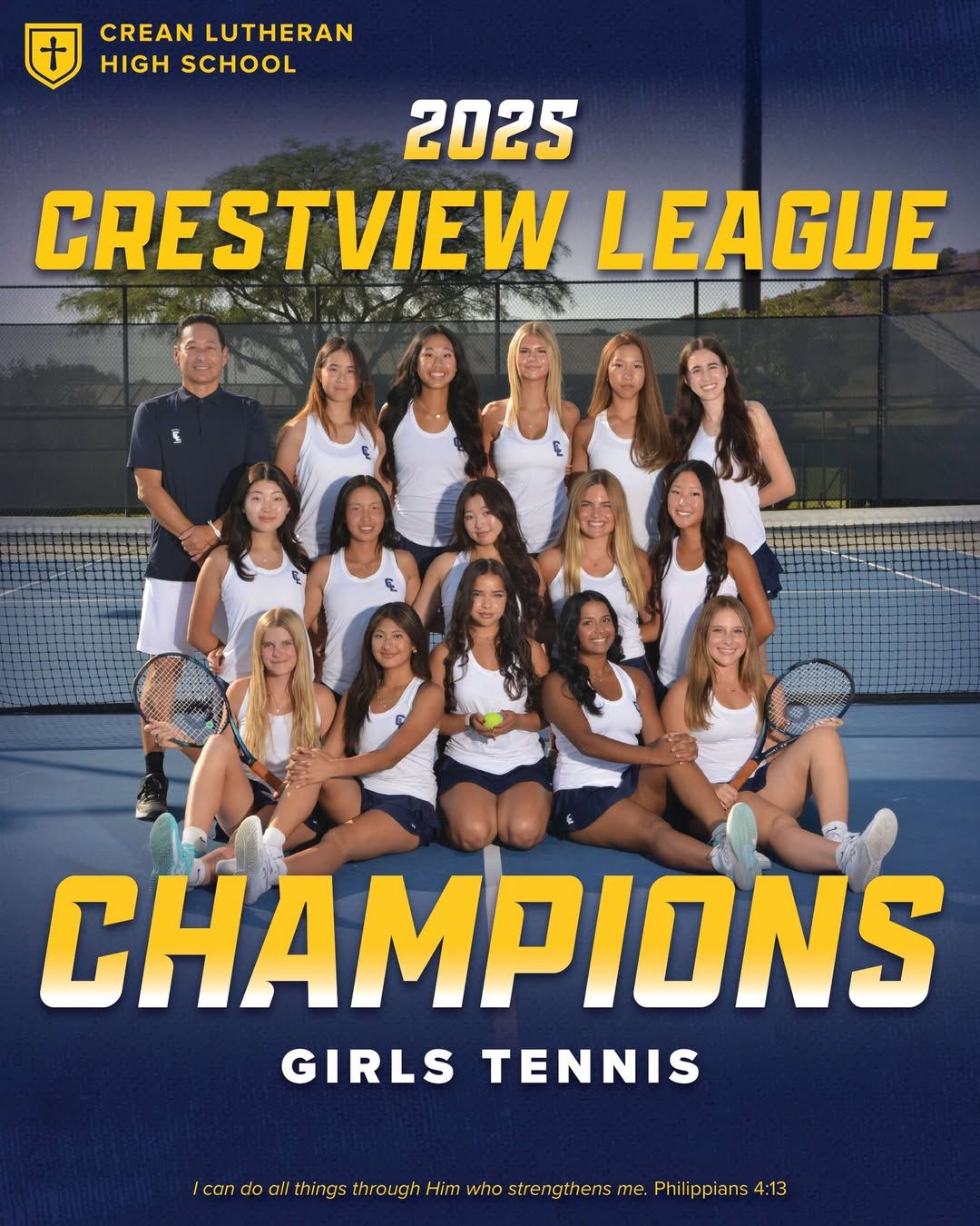 Crean Lutheran’s Girls Tennis team clinched the Crestview League Championship, finishing the season undefeated in league play. The Saints’ hard work, perseverance, and teamwork led them to this title as they now advance to the Individual and Pairs League Tournament this week.