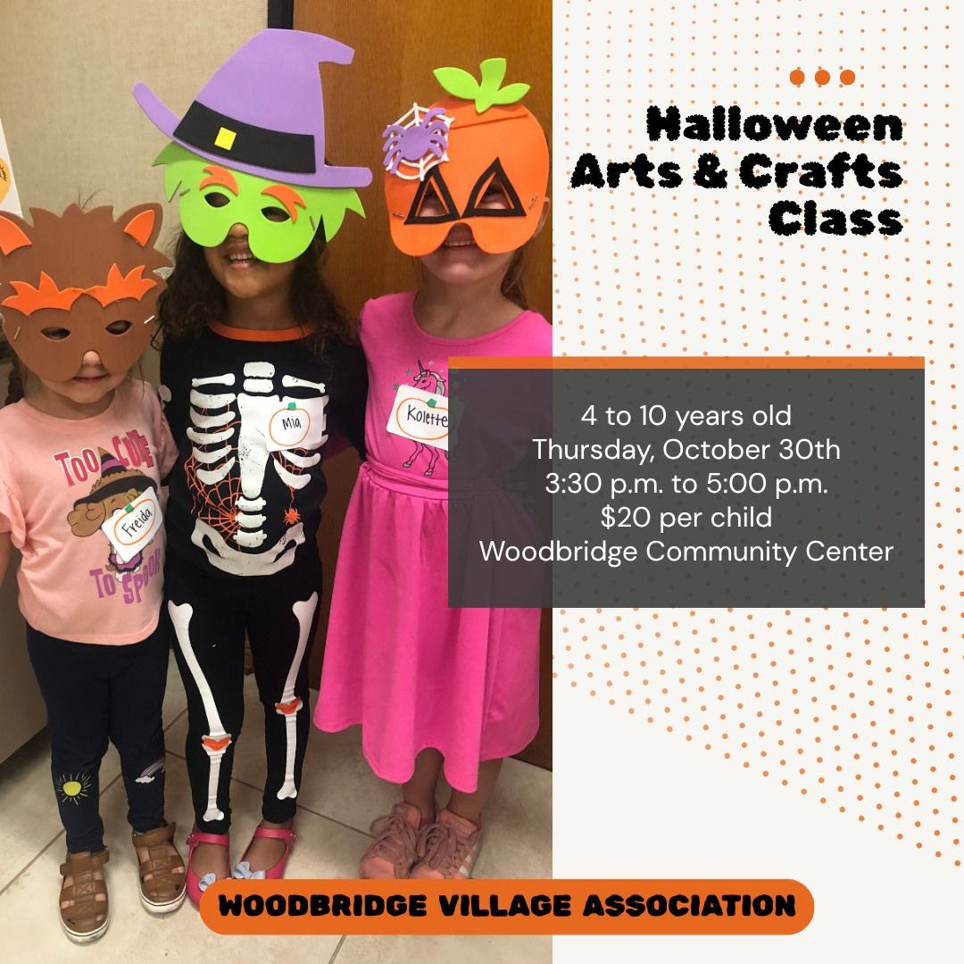 Woodbridge Village Association invites kids ages 4–10 to a Halloween Arts & Crafts Class on Thursday, October 30, from 3:30–5:00 p.m. at the Woodbridge Community Center. Children can get creative with fun holiday projects and are welcome to wear their costumes.